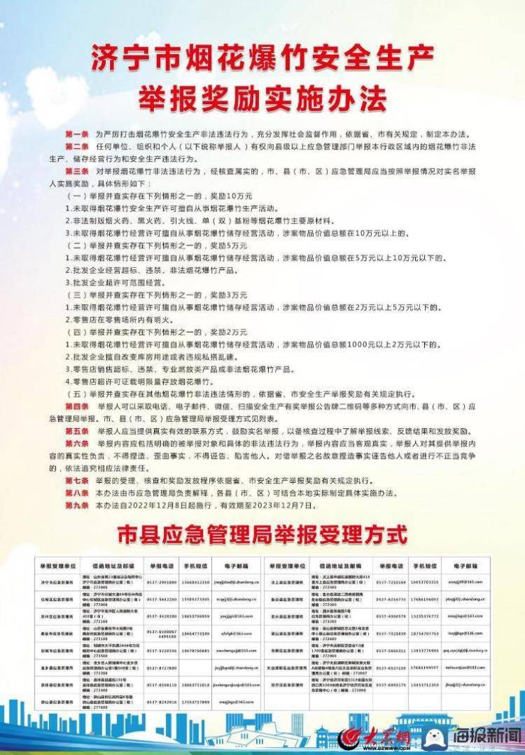 近日,济宁市制定出台了《济宁市烟花爆竹安全生产举报奖励实施办法》,鼓励广大市民群众举报烟花爆竹非法违法行为,一经查实则对实名举报人实施重奖,扎实推进烟花爆竹打非治违专项行动。