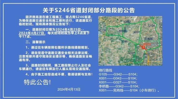 因济微高速在建工程施工,需占用S246省道,为确保道路交通安全和施工顺利进行,该道路实行临时封闭。现将具体情况公告如下: