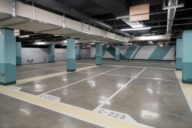 地下车库地面采用金刚砂耐磨地坪加表面渗透固化剂处理,车位车道分色处理,整体观感整洁、干净,条理清晰。