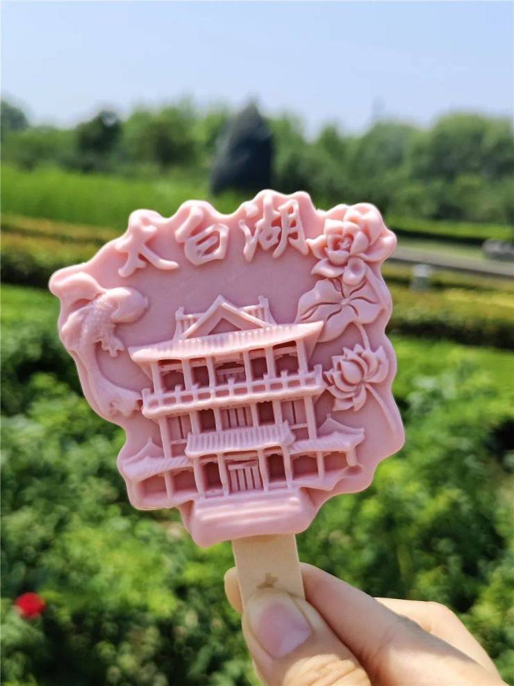 雪糕上的精美图案是太白湖地标性建筑北湖阁,同时将鲤鱼与荷花融入其中,生动形象,突显景区特色,可谓寓意美好。造型采用浮雕设计,层次分明,颜值和口味都在线,拿着拍照自然很“出片”。