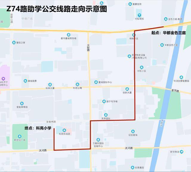 Z74路:华都金色兰庭—长虹小区—黄庄—华夏银行—祥和花园—市公安局—科苑小学。运营里程4.6公里,日发班次4个,投入车辆1台,运营时间根据学校授课时间动态调整。