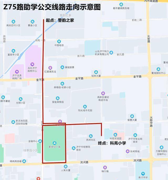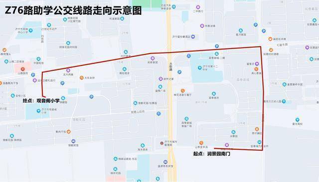 Z75路:警韵之家—舜泰园—广场东路—济宁书城—科苑小学。运营里程4公里,日发班次4个,投入车辆1台,运营时间根据学校授课时间动态调整。