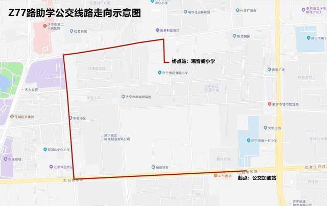 Z77路:公交加油站—齐鑫花园—济宁国投四季郎悦—车轮厂小区—第二人民医院—观音阁小学。运营里程2.5公里,日发班次4个,投入车辆1台,运营时间根据学校授课时间动态调整。