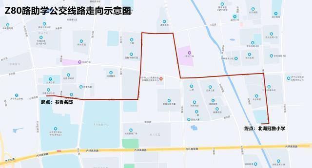 Z80路:书香名邸—北湖西路荷花路—中央公园南门—新城发展西—明德花园东门—京杭路河都路—北湖冠鲁小学。运营里程6.4公里,日发班次4个,投入车辆1台,运营时间根据学校授课时间动态调整。