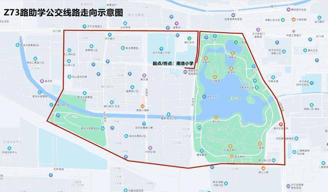 Z73路:南池小学—南池公园(东)—南苑街道—景东园小区—南池公馆南门—水景园C区—南池水景园—忠心闸社区—博古庄—南池小学。运营里程4.8公里,日发班次4个,投入车辆1台,运营时间根据学校授课时间动态调整。