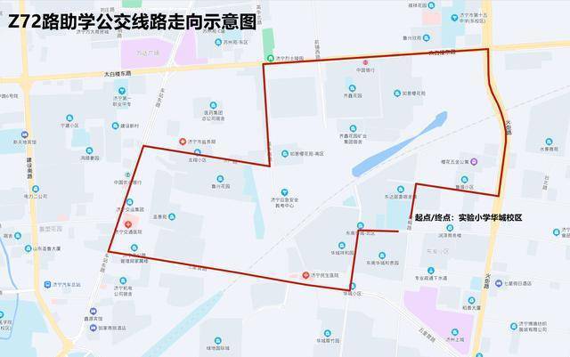 Z72路:实验小学华城校区—绿地国际城—三里营立交桥—鲁塑烧烫伤医院—储运站小区—水产路英华南路—英华南路太白楼路—济宁国投四季郎悦—齐鑫花园—市政工程处—实验小学华城校区。运营里程6.5公里,日发班次4个,投入车辆1台,运营时间根据学校授课时间动态调整。