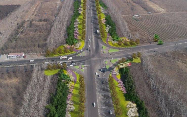 济宁高铁北站站前路通过植物造景打造桃花掩映的春景大道。