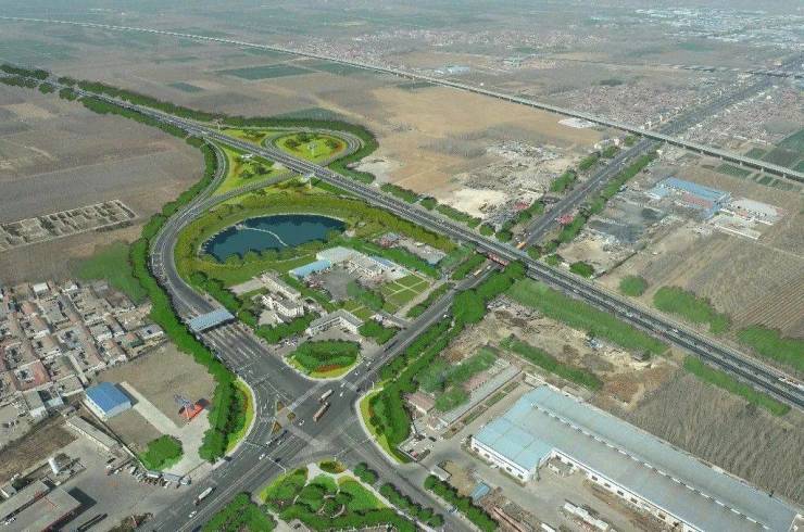 日兰高速济宁北出入口通过梳理现状植被,移栽部分乔木,塑造林水相映的大地艺术景观。