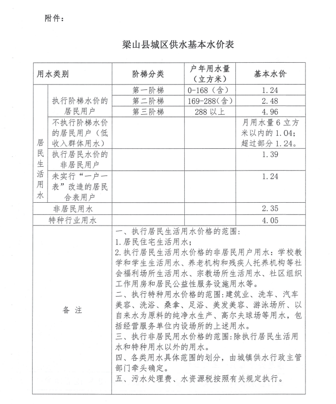 近日,搜狐网济宁小编从梁山县人民政府网站了解到:为落实《山东省人民政府关于落实节水优先方针全面推进水资源节约集约利用的意见》(鲁政发(2025)12号),《关于印发〈关于深化水价机制改革促进水资源节约集约利用的实施方案>的通知》(鲁发改价格(2021)1059号)有关要求,经研究决定,城区居民阶梯水价基本水价按1:2:4比例核定,其他事宜仍按《关于城区居民生活用水实行阶梯价格制度的通知》(梁发改价格(2022)19号)、《关于调整城区非居民和特种行业用水基本水价的通知》(梁发改(2023)20号)规定执行。调整后的城区基本水价见附件。