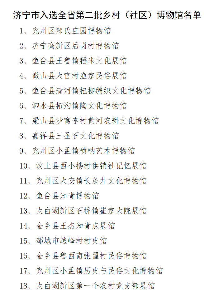 近日,山东省文化和旅游厅公布全省第二批乡村(社区)博物馆名单,济宁市18家乡村(社区)博物馆成功入选认定名录,数量位居全省第一。