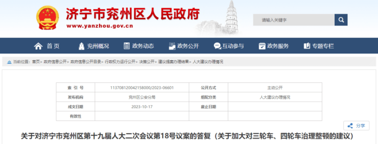 搜狐网济宁小编了解到:近日,兖州区人民政府网回复了网友们提出对三轮车、四轮车治理整顿的问题,一起来看。
