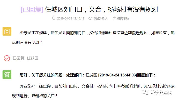 任城区回复:目前刘门口村、义合村、杨场村尚未明确搬迁计划,远期规划仍按照原规划进行。