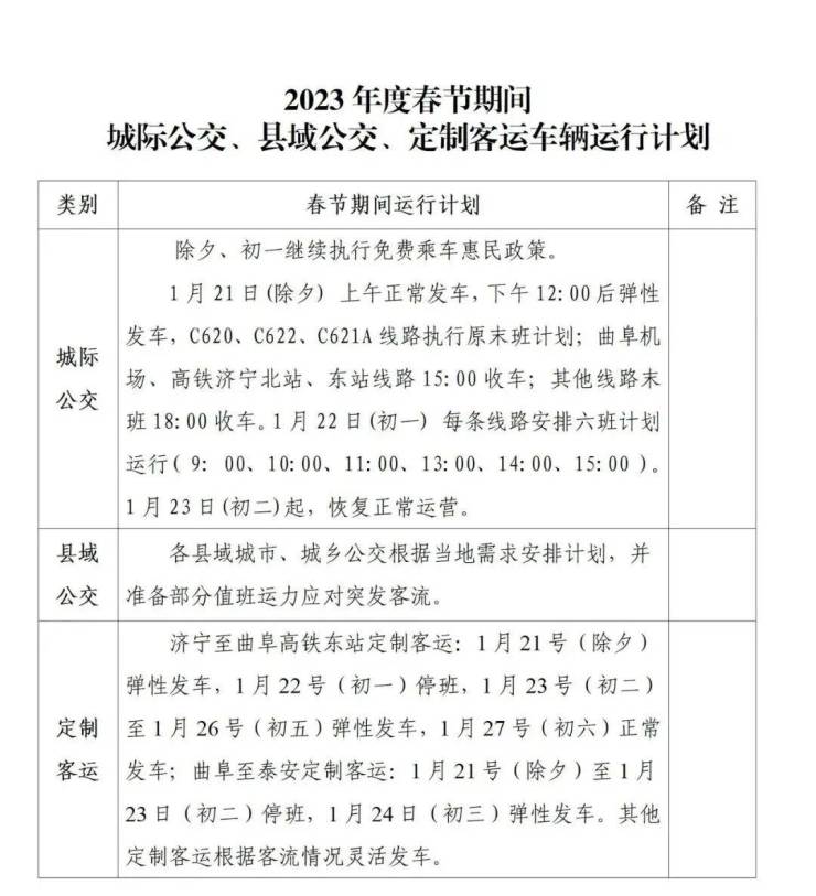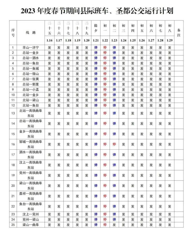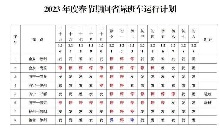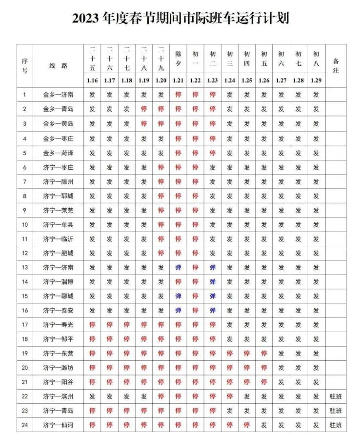 为了方便广大旅客春节期间的出行,现将济宁各汽车站春节期间班车运行计划予以公示,请各位旅客提前做好出行规划,避免延误行程。实际运行情况以当日实际计划为准。