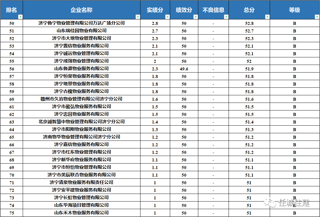 日前,任城区住建局对全区所有物业项目进行了全面摸排,依据各项目信用得分情况,由市物业信用系统实时生成了各物业企业较新排名,其中排名A级及以上的11个,成为物业企业服务中的优秀生,而C级的有14家物业企业,排名倒数。
