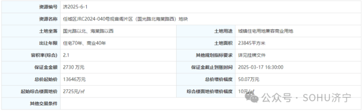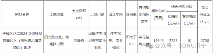 济宁市任城区再次挂牌土地!搜狐网济宁小编相关渠道获悉:经济宁市人民政府批准,济宁市自然资源和规划局决定以网上挂牌方式出让济宁市任城区1宗国有建设用地使用权,土地用途为城镇住宅用地兼容商业用地;土地总面积为23845㎡,约36亩;总起始价为13646万元