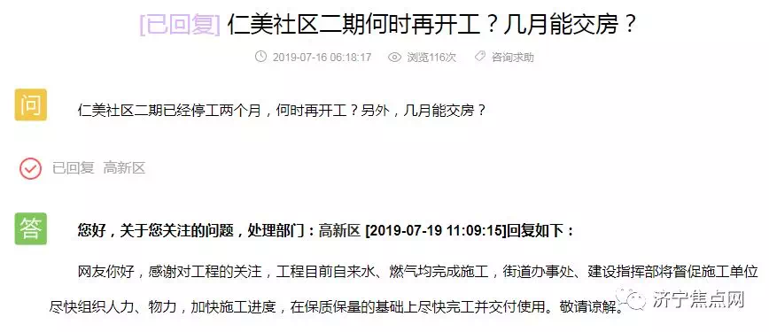 网友提问:仁美社区二期已经停工两个月,何时再开工?另外,几月能交房?