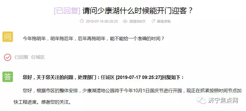 任城区回复:根据市区的整体安排,少康湖湿地公园将于今年10月1日国庆节进行开园,现正在抓紧按照时间节点加快工程进度。