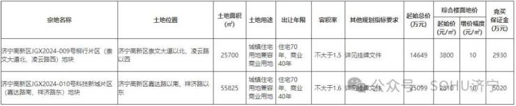 土地位于:济宁高新区嘉达路以南、祥济路以东;土地面积:55825㎡(约83.7亩);土地用途:城镇住宅用地兼容商业用地;出让年限:住宅70年,商服40年;容积率不大于1.6;起始价:25099万元,综合楼面价起价:2810元/㎡;最终成交价为:25099万元(约300万元/亩),综合楼面地价成交价:2810元/㎡;溢价率:0.0%;