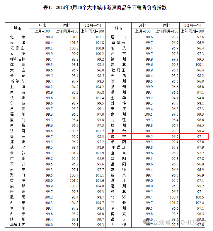 搜狐网济宁小编注意到:今早9点30分,国家统计局发布了2024年2月份70个大中城市商品住宅销售价格变动情况统计数据。2024年2月份济宁新建商品住宅销售价格环比下降0.5个百分点。