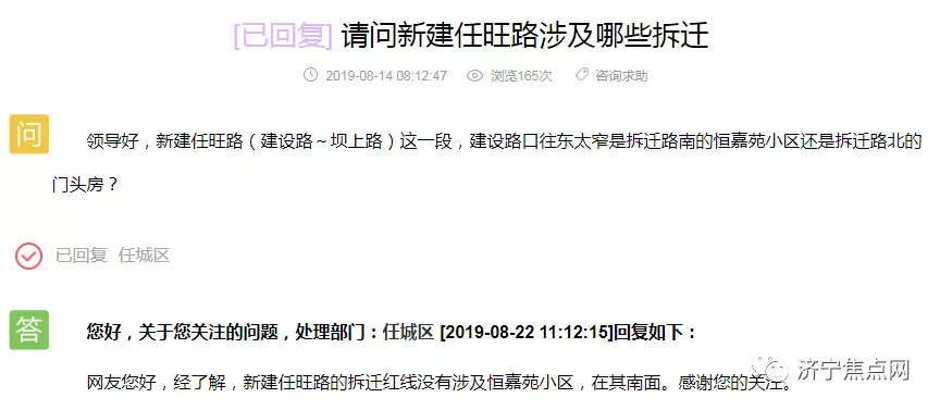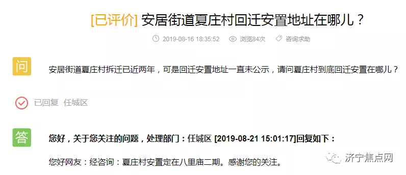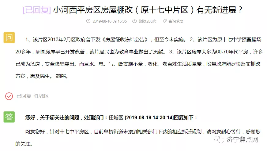 小河西平房区房屋棚改(原十七中片区)有无新进展?凌云小区未来有没有规划?胡厂村接通知下月拆迁,请问是否属实?南张镇宋南村和宋北村19年有无拆迁计划?带着这些问题,济宁搜狐焦点房产网小编去济宁市网络问政平台上找到了答案,下面请跟随小编一起去看下。