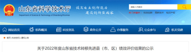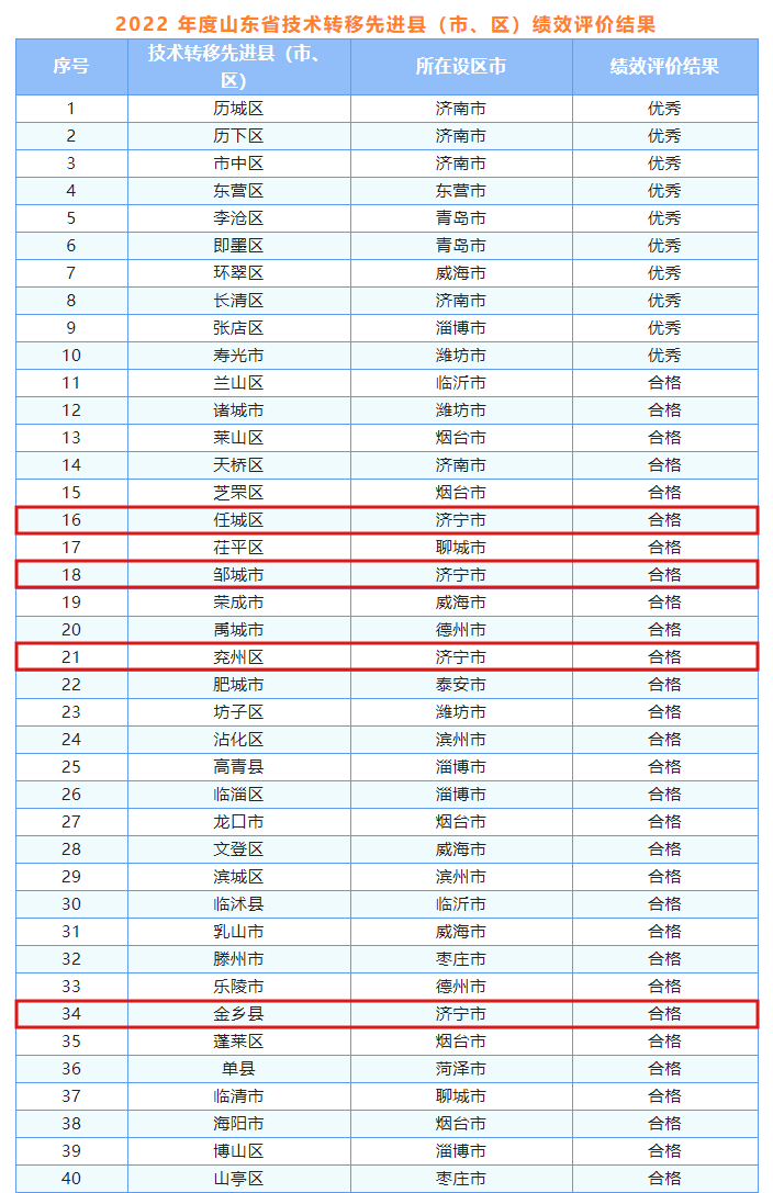 8月17日,山东省科学技术厅发布《关于2022年度山东省技术转移先进县(市、区)绩效评价结果的公示》,公示时间为8月17日至23日,济宁4地名列其中。详细名单如下: