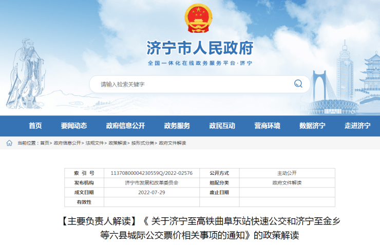 上述价格自2022年8月1日起施行,有效期至2027年7月31日。《关于济宁至高铁曲阜东站快速公交和济宁至金乡鱼台汶上城际公交票价的通知》(济价格字〔2017〕63号)、《关于公布济宁至泗水微山梁山城际公交线路票价的通知》(济价格字〔2017〕118号)、《关于修订<关于济宁至高铁曲阜东站快速公交和济宁至金乡鱼台汶上城际公交票价的通知>的通知》(济发改价格〔2020〕387号)同时废止。