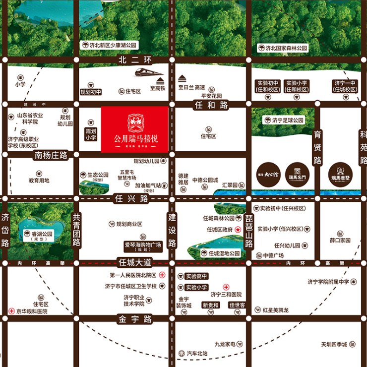 项目周边任城湿地公园、森林公园、济宁足球公园等优质生活配套环伺。休闲健身、移步易景,满满的负氧离子,与公园的花鸟鱼虫一起呼吸。毗邻济宁实验初中、实验小学、济宁一中任城校区,项目西侧规划学校用地,名校为邻,名师领航,铺就学子成长之路。