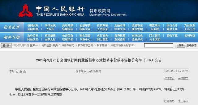 中国人民银行授权全国银行间同业拆借中心公布,2023年3月20日贷款市场报价利率(LPR)为:1年期LPR为3.65%,5年期以上LPR为4.3%。以上LPR在下一次发布LPR之前有效。