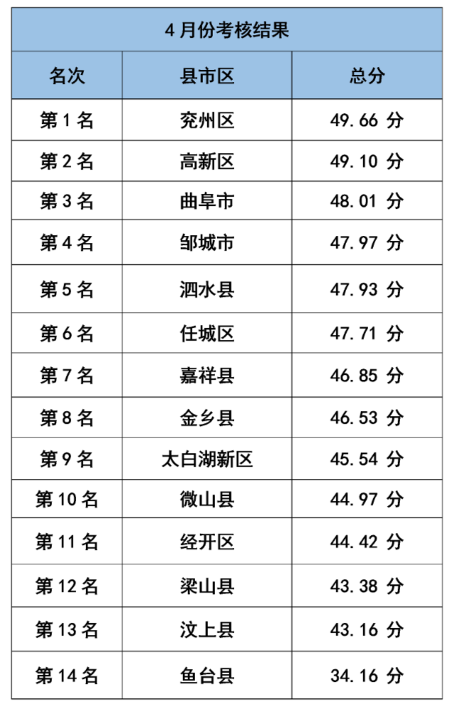 根据《济宁市生态环境保护考核工作实施细则》(济环委办〔2020〕2号),对各县(市、区)2021年4月份的生态环境保护工作进行考核,现将考核结果予以通报。