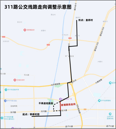 311路:由“银都花园”发车,沿原线运营至菱花南路,沿菱花南路向北至大禹西路,沿大禹西路向东进入原线路运营至终点站“皇桥村”。