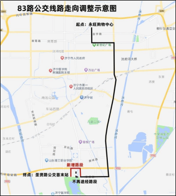 83路:由“永旺购物中心”发车,沿原线路至圣贤路,沿圣贤路向西至运河路,沿运河路向北至济宁大道,沿济宁大道向西至春华路,沿春华路向南至终点站“圣贤路公交首末站”。