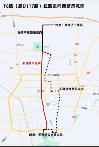 T6路(仅工作日运营):由“圣贤路公交首末站”发车,沿春华路向北至济宁大道,沿济宁大道向东至运河路,沿运河路向北至共青团路,沿共青团路向北至济北旅游大道,沿济北旅游大道向北至站前路,沿站前路向东至终点站“高铁济宁北站”。