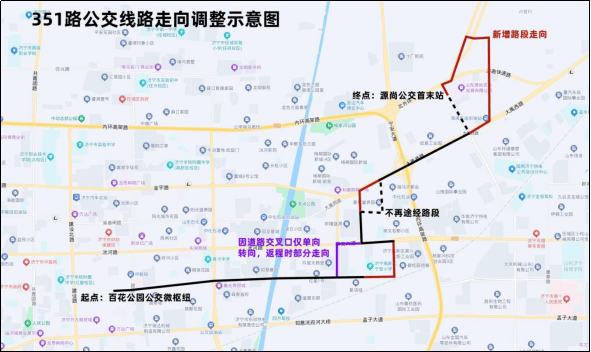 351路:由“源尚公交首末站”发车,沿同济路向北至崇德大道,沿崇德大道向东至杨家河路,沿杨家河路向北至孙桥、王桥村,经王桥村、南营村向南至大禹西路,沿大禹西路向西至杨桥街,因崇文大道与杨桥街交叉口仅右转通行,车辆沿杨桥街向南至崇文大道,沿崇文大道向西至菱花南路,沿菱花南路向南至红星路,沿红星路向西进入原线路至终点站“百花公园微枢纽”。返程时由红星路向东至崇文街,沿崇文街向北至崇文大道,沿崇文大道向东调头后向西至杨桥街,沿杨桥街向北行驶至终点站。