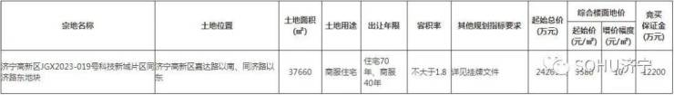 土地位于:济宁高新区嘉达路以南、同济路以东;土地面积:37660㎡(约57亩);土地用途:商住用地;出让年限:住宅70年、商服40年;容积率不大于1.8;起始价:24269万元,综合楼面价起价:3580元/㎡;最终成交价为:24269万元(约426万元/亩),综合楼面地价成交价:3580元/㎡;溢价率:0.0%;