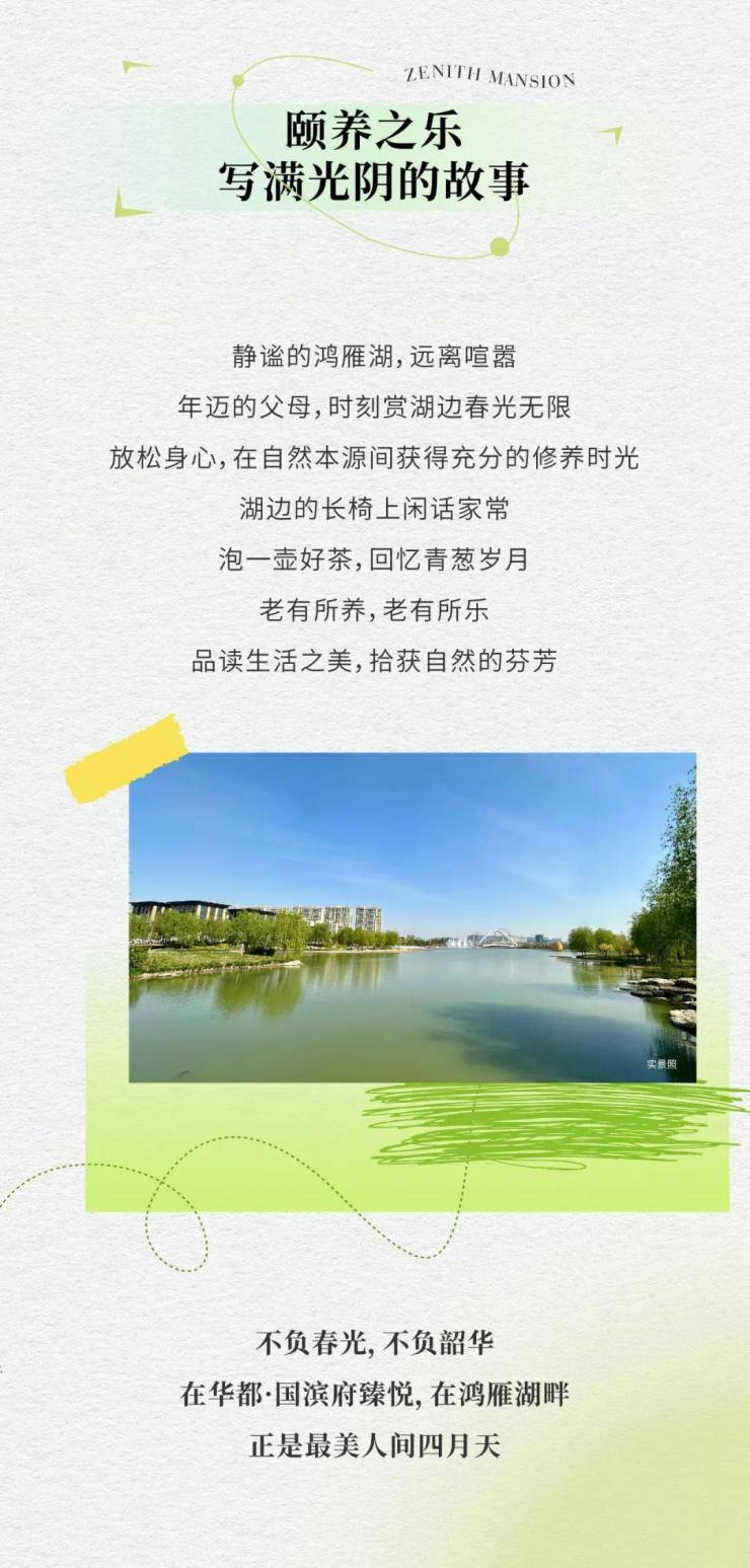 静谧的鸿雁湖,远离喧嚣。年迈的父母,时刻赏湖边春光无限。放松身心,在华都国滨府·臻悦自然本源间获得充分的修养时光,湖边的长椅上闲话家常。泡一壶好茶,回忆青葱岁月。老有所养,老有所乐。品读生活之美,拾获自然的芬芳。