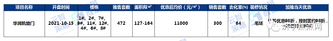 本周华润凯旋门项目加推,共计472套,去化率64%。