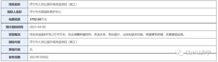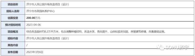 近日,搜狐网济宁小编在相关渠道获悉:济宁市市政园林养护中心公开对济宁市人民公园升级改造项目招标,具体如下: