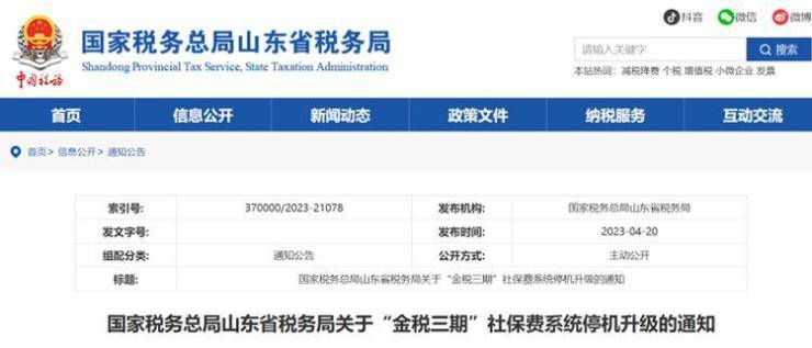近日,国家税务总局山东省税务局发布通知,国家税务总局山东省税务局将于2023年4月21日(周五)19:00至4月23日(周日)8:00进行“金税三期”社保费系统停机升级工作。期间,山东省电子税务局、社保费缴费客户端、微信社保费缴纳小程序、支付宝社保费缴纳、银