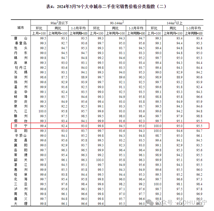 3月份二手住宅销售价格分类指数方面:济宁90平米及以下户型价格较上月环比降0.6%,90平米-144平米户型价格较上月降0.2%,144平米以上户型价格较上月环比降0%。