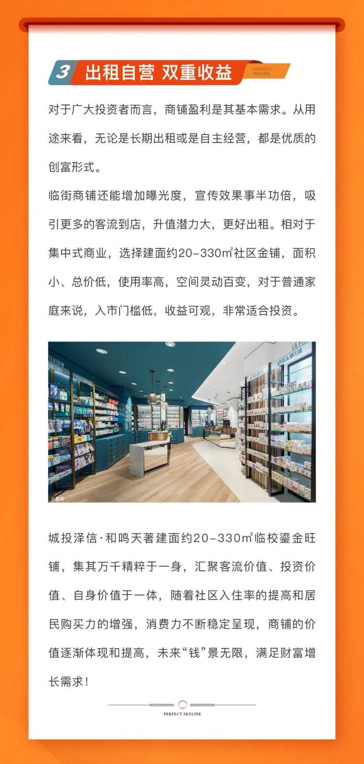 城投泽信·和鸣天著建面约20-330㎡临校鎏金旺铺,集其万千精粹于一身,汇聚客流价值、投资价值、自身价值于一体,随着社区入住率的提高和居民购买力的增强,消费力不断稳定呈现,商铺的价值逐渐体现和提高,未来“钱”景无限,满足财富增长需求!