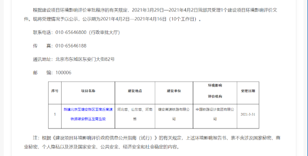 近日,生态环境部官网对《新建北京至雄安新区至商丘高速铁路雄安新区至商丘段》建设项目环境影响评价文件进行公示,文件中显示,该项目计划开工时间为2021年6月,预计投产时间为2025年6月。