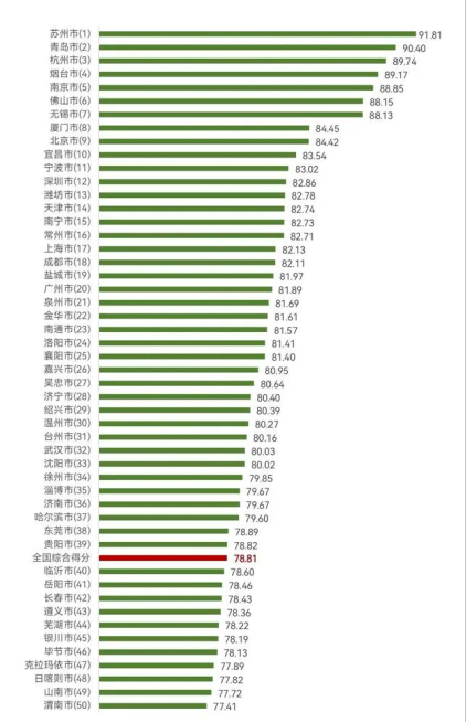 其中,7个山东城市入围,按先后顺序排列,依次是青岛、烟台、潍坊、济宁、淄博、济南、临沂。