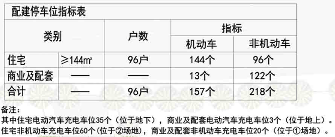 项目规划建设用地面积2.57公顷;总建筑面积:52035.78㎡;其中,地上建筑面积:28823.45㎡,地下建筑面积:23212.33㎡;4层多层住宅,一层层高3.3米,二至四层层高3.1米,建筑高度13.05米;6层多层住宅,一层层高3.5米,二至六层层高3.2米,建筑高度为20.25米;容积率为1.15;建筑密度为29.03%;绿地率为35%;计划总居住户(套)数为96户(套),居住人数约308人(按3.2人/户预算);建筑类型包括住宅、商业、公服配套设施等;规划机动车停车位157个,非机动车位218个。