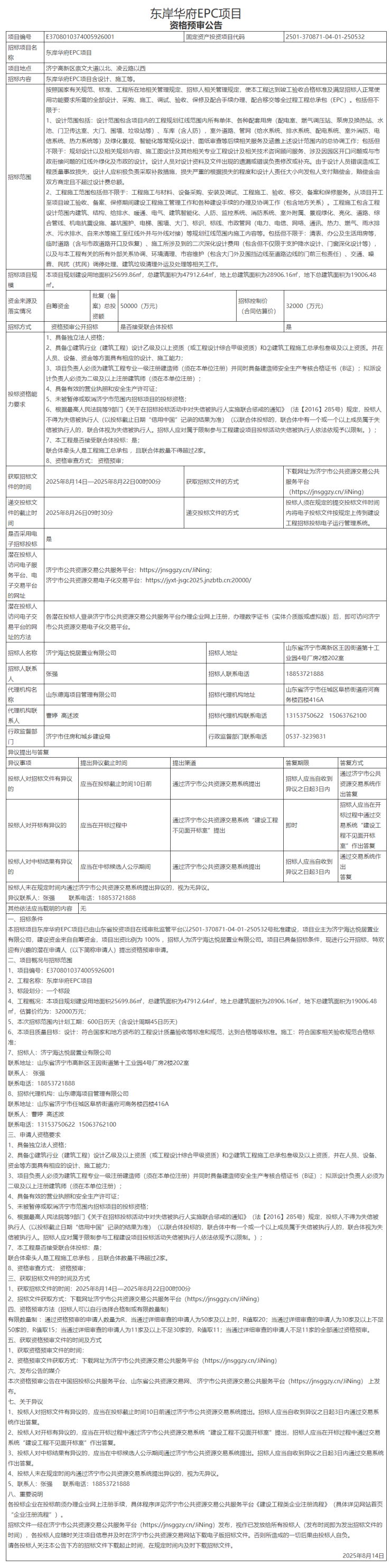 本招标项目东岸华府EPC项目已由山东省投资项目在线审批监管平台以2501-370871-04-01-250532号批准建设,项目业主为济宁海达悦居置业有限公司,建设资金来自自筹资金,项目出资比例为 100% ,招标人为济宁海达悦居置业有限公司。项目已具备招标条件,现进行公开招标,特欢迎有兴趣的潜在申请人(以下简称申请人)提出资格预审申请。