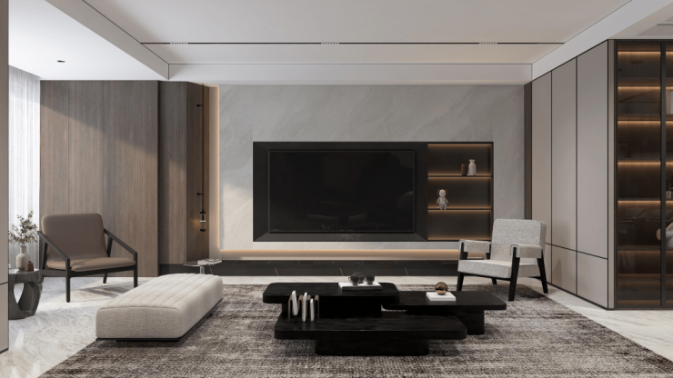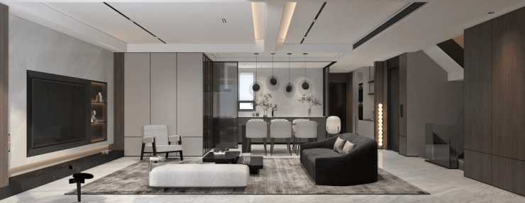 遵循国人传统的客厅考究,以宽广尺度和双层挑空,彰显家中阔朗气蕴。奢华的大客厅,舒展优质自然光线,将水岸风光写入家的幸福时光。