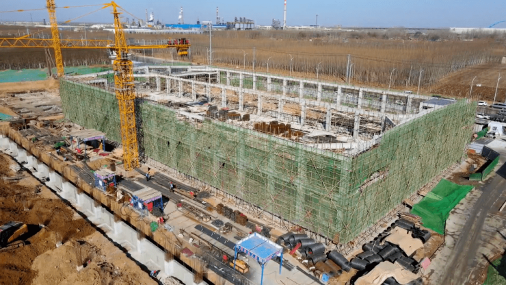 在山东金宇膜科技发展有限公司年产500万平方米石墨烯增强水处理膜项目施工现场,一片繁忙景象,工人和机械正在有条不紊地进行施工。