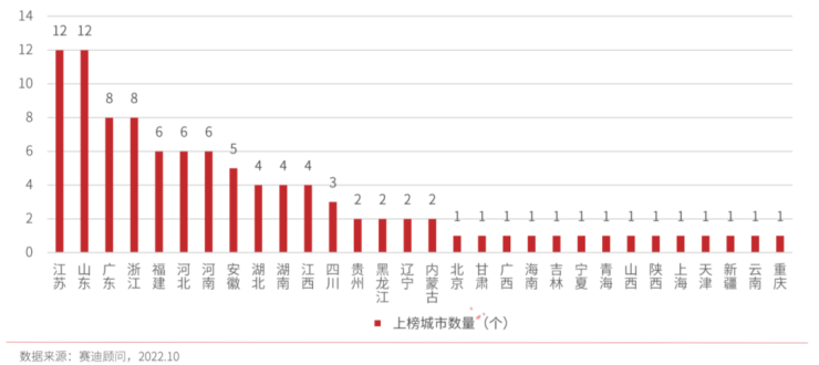 《报告》显示,2022年,数字城市百强主要分布在经济发展水平较高的地区。从区域分布看,华东地区百强城市数量居首,共48个城市上榜。从省级行政区域分布看,江苏和山东上榜城市数量均为12个,广东和浙江上榜城市数量均为8个。