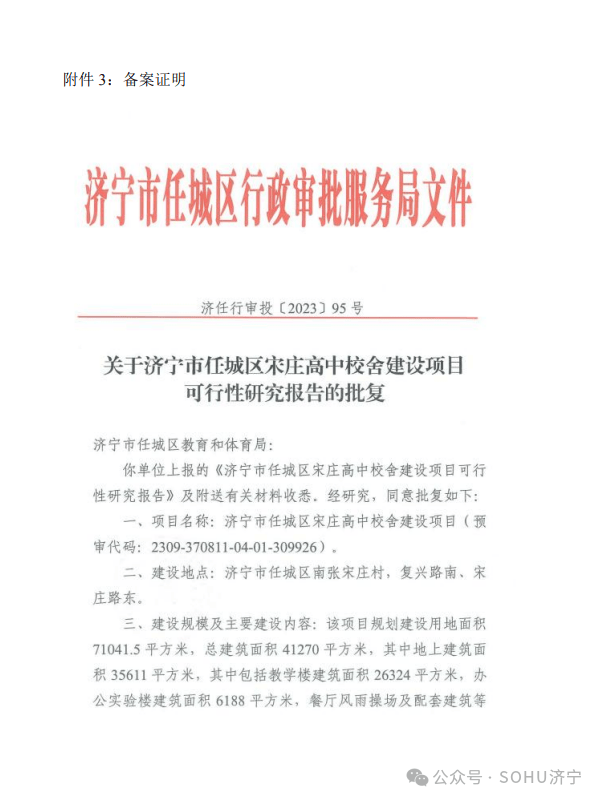 该项目在官方文件中存在命名冲突,早期规划名称为“济宁市任城区宋庄中学”,未明确学段。然而,2025年1月公示的《济宁市任城区宋庄高中校舍建设项目环境影响报告表》明确指出,项目行业类别为“普通高中教育”,并详细列明了高中教学设施(如化学、生物实验室)的环保措施。这一文件由济宁市任城区教育和体育局编制,经生态环境部门审批,具有权威性。任城区政府门户网站及生态环境局多次公示中,均使用“宋庄高中校舍建设项目”名称,进一步确认了项目的普通高中性质。