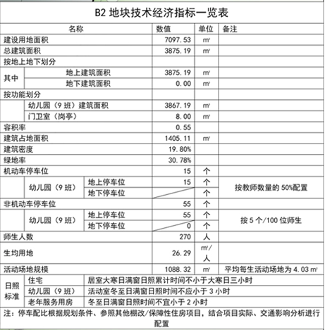 B2地块为幼儿园用地,规模为9班,建设用地面积7097.53㎡(约10.6亩);总建筑面积3875.19㎡;其中地上建筑面积3875.19㎡,地下建筑面积0㎡;容积率0.55;建筑密度19.80%;绿地率30.78%;师生人数270人,生均用地26.29㎡/人;建筑类型包括幼儿园、配套设施等;机动车停车位15个,非机动车停车位55个。