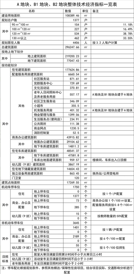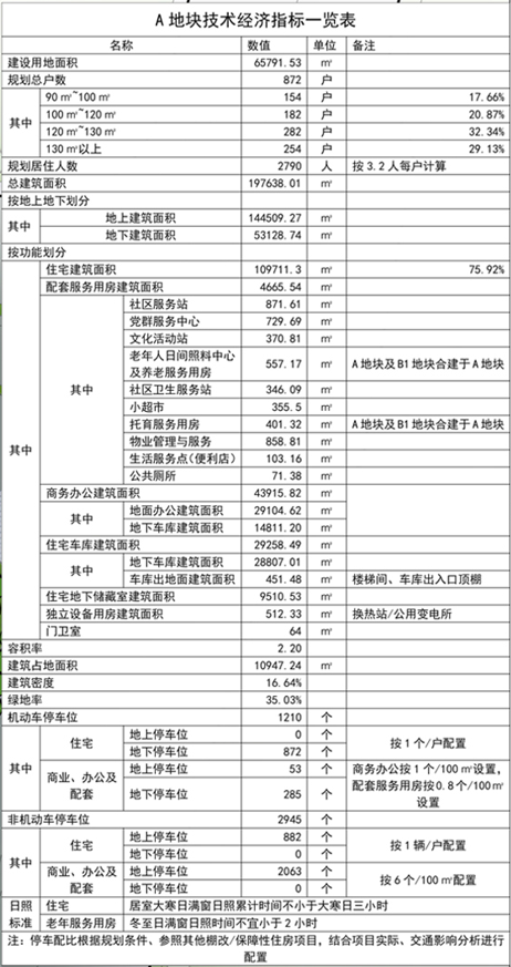 A地块为居住用地兼商业服务设施用地,建设用地面积65791.53㎡(约99亩);总建筑面积197638.01㎡;其中地上建筑面积144509.27㎡,地下建筑面积53128.74㎡;容积率2.2;建筑密度16.64%;绿地率35.03%㎡;计划总居住户(套)数为872户(套),居住人数约2790人(按3.2人/户预算);建筑类型包括住宅、商业、办公及配套设施等;机动车停车位1210个,非机动车停车位2945个;